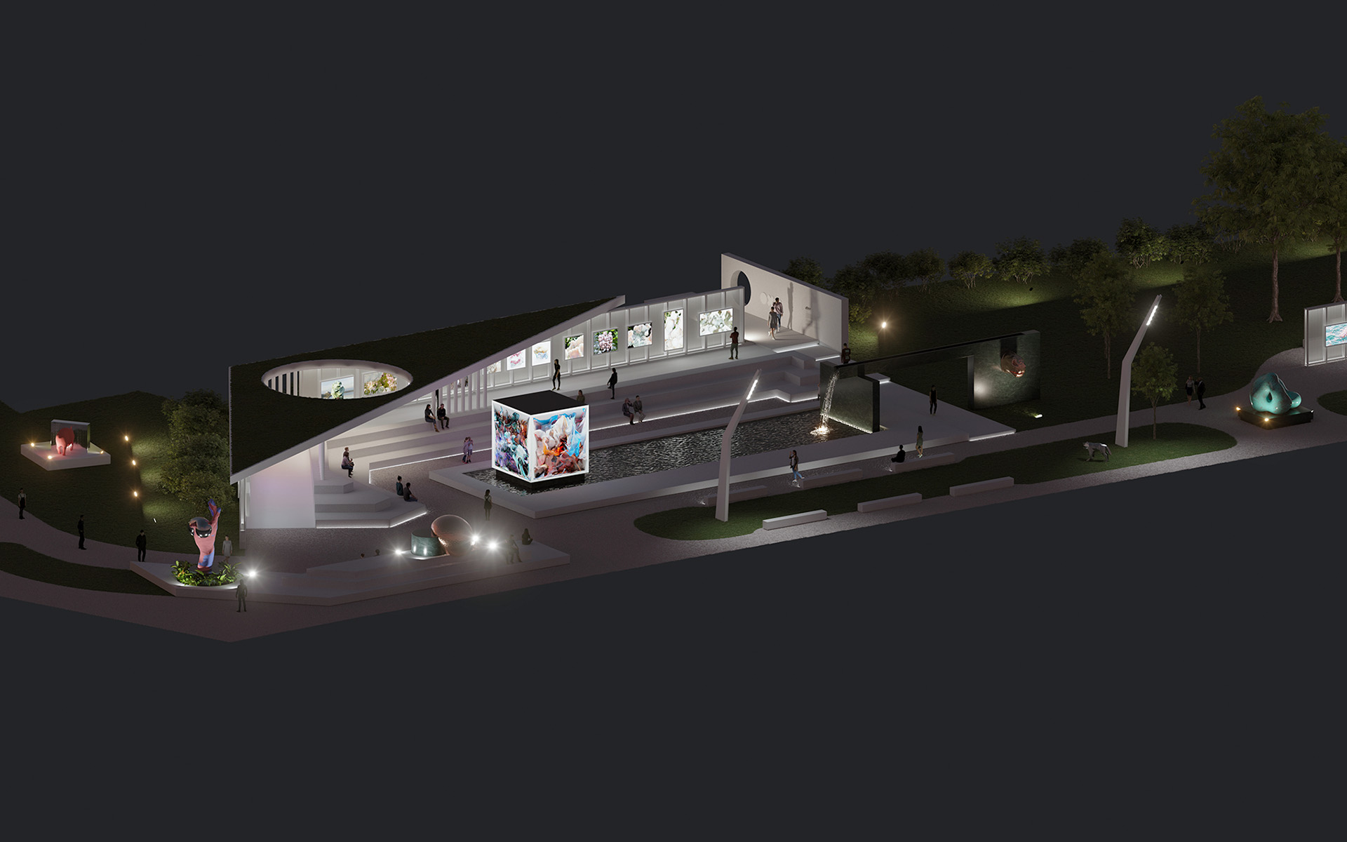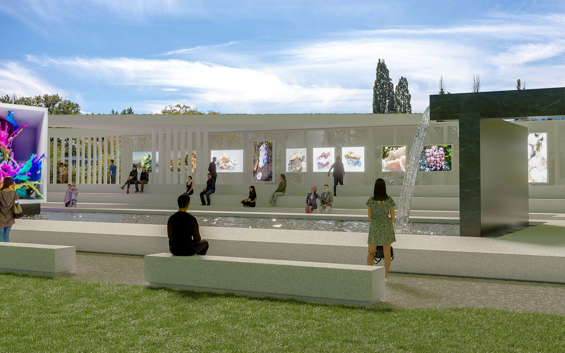 – Un bassin d’eau avec fontaine rehausse l’expérience auditive, créant une zone de contemplation et ajoutant des réflexions aux projections vidéo.