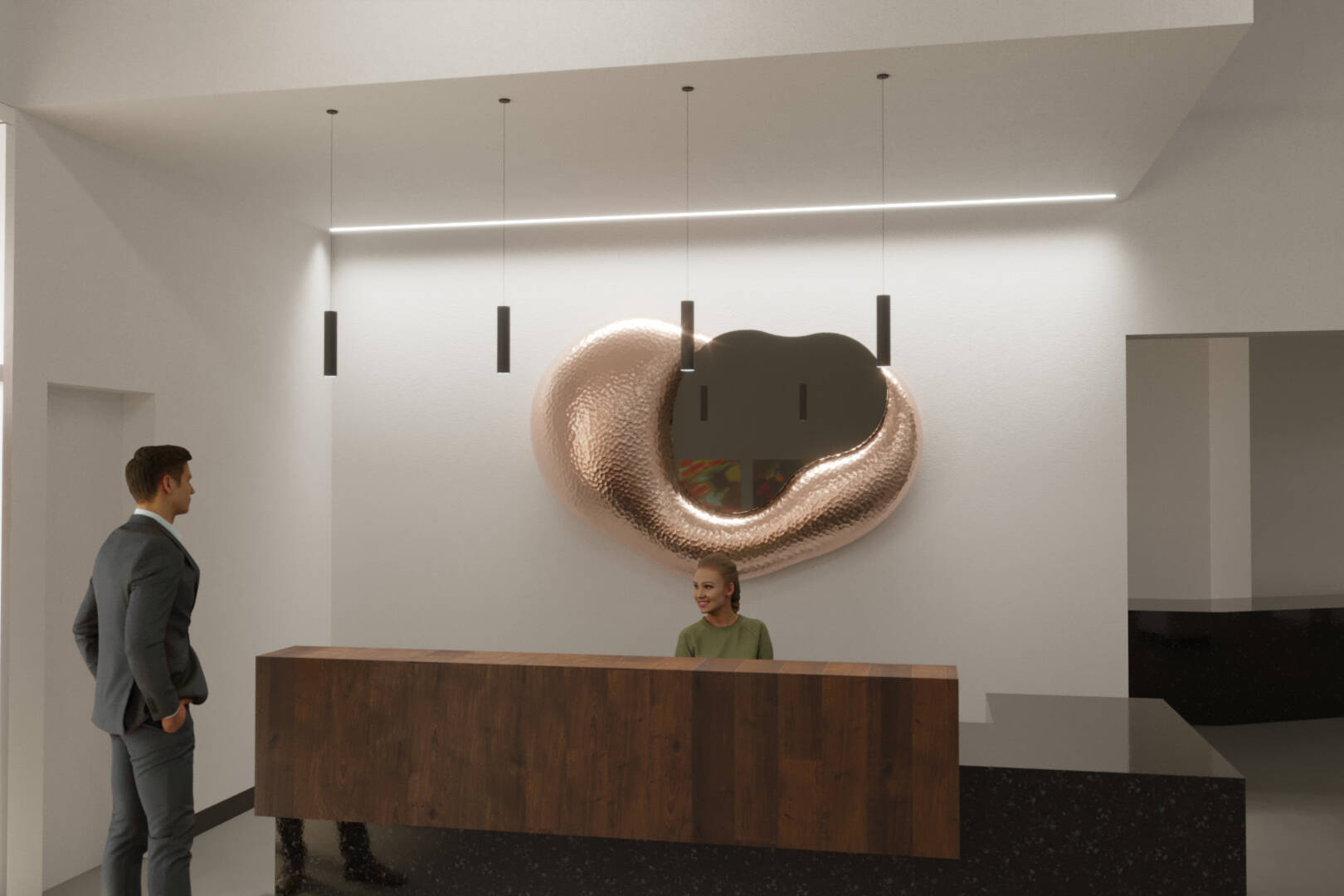 Inspirée des principes muséaux, la galerie présente un design minimaliste et raffiné, fortement influencé par l’architecture contemporaine. Cette simplicité est délibérée, offrant une toile de fond qui permet au contenu artistique de prendre toute la place et de s’adapter aisément à différentes expositions thématiques. La disposition de l’espace est volontairement fragmentée en sections distinctes, facilitant l’attribution de zones individuelles aux créations de chaque artiste. En plus d’incorporer des sculptures, la galerie s’ouvre sur la rue tout en cachant des surprises plus intimes en son cœur.